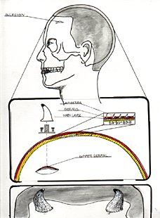 "Chris's horn implants are becoming more and more common. I've done about a dozen of them over the past 9 months. It involves making two incisions in the upper dermal and implanting a 1 inch stainless steel plug. From this plug protrudes an 1/8 inch threaded steel rod that raises out for approx. 1 inch. We then close the incision and use a special suture style to make sure there is no scarring." Once the incision's heal and the sutures dissolve Chris is able to apply the thicker "horns" unto the threaded pole."