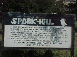 "Many years ago an Indian village on Lake Wales was plagued by raids of a huge gator. The Chief, a great warrior, killed the gator in a battle that created a small lake. The chief was buried on the north side. Pioneer mail riders first discovered their horses laboring down hill, thus naming it "Spook Hill." When the road was paved, cars coasted up hill. Is this the gator seeking revenge, or the chief still trying to protect his land?"