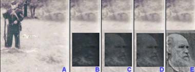 "I think the thunderbird or pterodactyl is a fake, however I find the photo interesting. I think the photo may indeed be genuinely from the 1800's. After the 'face' was found, I decided to take a closer look at the photo myself. I viewed the 'negative' image and found some guy that looks like Charles Darwin! He may not be Charles, but he looks like Charles.