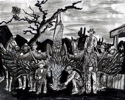 In April 1890 the Tombstone Epitaph (and/or possibly another) newspaper reported that 2 men had shot and killed a Thunderbird. Many people claimed that a picture accompanied the article which showed the gigantic bird with a wingspan of anywhere from 20 to 160 feet (recollections are vague) in front of a group of men. An exhaustive search by the Epitaph, authorities on old west photography and several different magazines over the years have failed to come up with the photo, but that hasn't stopped people from claiming that they saw it. People have claimed to see it in either a men's magazine of the 60's, on a television interview show or in tabloids from the 70's. Almost all the descriptions are of a group of old west men standing by the bird and not of Union soldiers. Since I'm not claiming this is the real thunderbird photo (if one exists) I can't expalin why this one has soldiers and not cowboys.