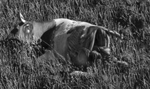 You always hear about small town folk being secretive. Not so in Spano where the motto seems to be "tell the outsiders everything." Within a coupla hours of hitting town we had already been given numerous explanations on the desert squid's whereabouts and mode of operation. One local even tried to sell us a "one of a kind" tentacle. (I politely refused the offer when I discovered several more "one of a kinds" sitting in a nearby cooler.) We did pick up some serious info from one local who prefers not to be named. Mr. Z, as I'll call him, (Basically cause Freakylinks already has a MR. X) told me that the desert squid had become active in the past few months and showed me a picture of a recent cow mutilation that had been attributed to the monster. More importantly, it was while we were inside Mr. Z's camper that we had a little attack of our own.