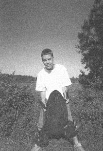 "Scruffs was barking like crazy." Timothy told me, "He would stick his nose into this big bush and then come out and just howl up a storm. I grabbed him back and took a look and saw the frog. He had gotten tangled up in a plastic six pack holder that was caught on a limb so he couldn't go anywhere. I unhooked him and grabbed him by the leg and dragged him out."
