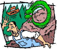 Hoop snakes were first reported by settlers in the North Carolina area in the 18th century. According to these old tales a hoop snake could grasp it's tail with it's mouth and roll down a incline as a way of moving. Hoop snakes are also said to have a fang in the tail which allows them to sting while in this peculiar rolling motion. One popular myth had a farmer being chased through the woods by a hoop snake. As it went to strike him, he dove behind a tree and the snake imbedded it's fang into the bark and died. The next day the farmer noticed that the tree had enlarged to twice it's normal size from the swelling of the poison. Needing a shed for his cows, he cut the tree down and made a barn with the wood. Over the next week, the poison dried out from the wood and made the shed he built grow smaller and smaller. Finally he was forced to build another shed for his cows and use the first one as a dog house.
