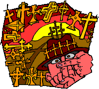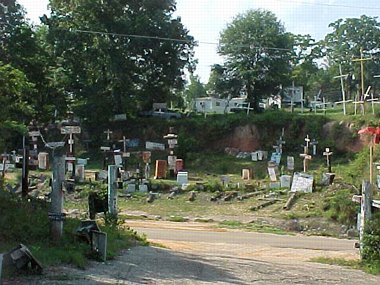 I just nod, squinting thru the windshield trying to make out the next landmark and trying not to think about how the heat is making me stick to the vinyl seat. Suddenly over a hill I see a single cross rising up thru the landscape like a radio tower to God. Then I see more of them, dozens, and then hundreds of crosses, lining both sides of the road. We've found our destination, the Cross Garden.