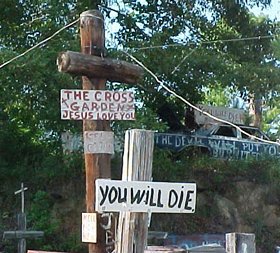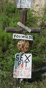 Jason pulls off the road and stops on the Alabama clay. I quickly get out to document the scene, sweat running off my brow like a river. Crosses of every shape and size line both sides of the road and lay on the ground. They're made of fence posts, old telephone poles, and two by fours. Apocalyptic signs are tacked to them, admonishing us that "hell is hot" and "you will die." A junked car stands up on side of an embankment with more dire warnings that our life is going to end.