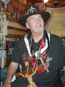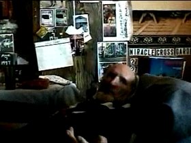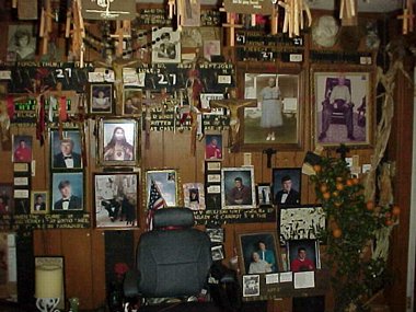 A knock on the door gets us a yelled "come in" and we enter. More crosses line the living room walls and ceiling. Half hidden by this plethora of religious icons is a 70-year-old man sitting on a La-Z-Boy recliner and sucking on a hard candy.